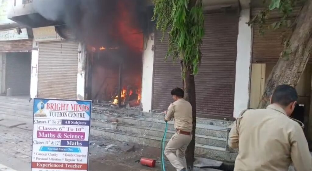 आगरा थाना कमला नगर के शालीमार एंक्लेव स्थित शांति प्लाजा में ई-स्कूटी की दुकान में लगी भीषण आग